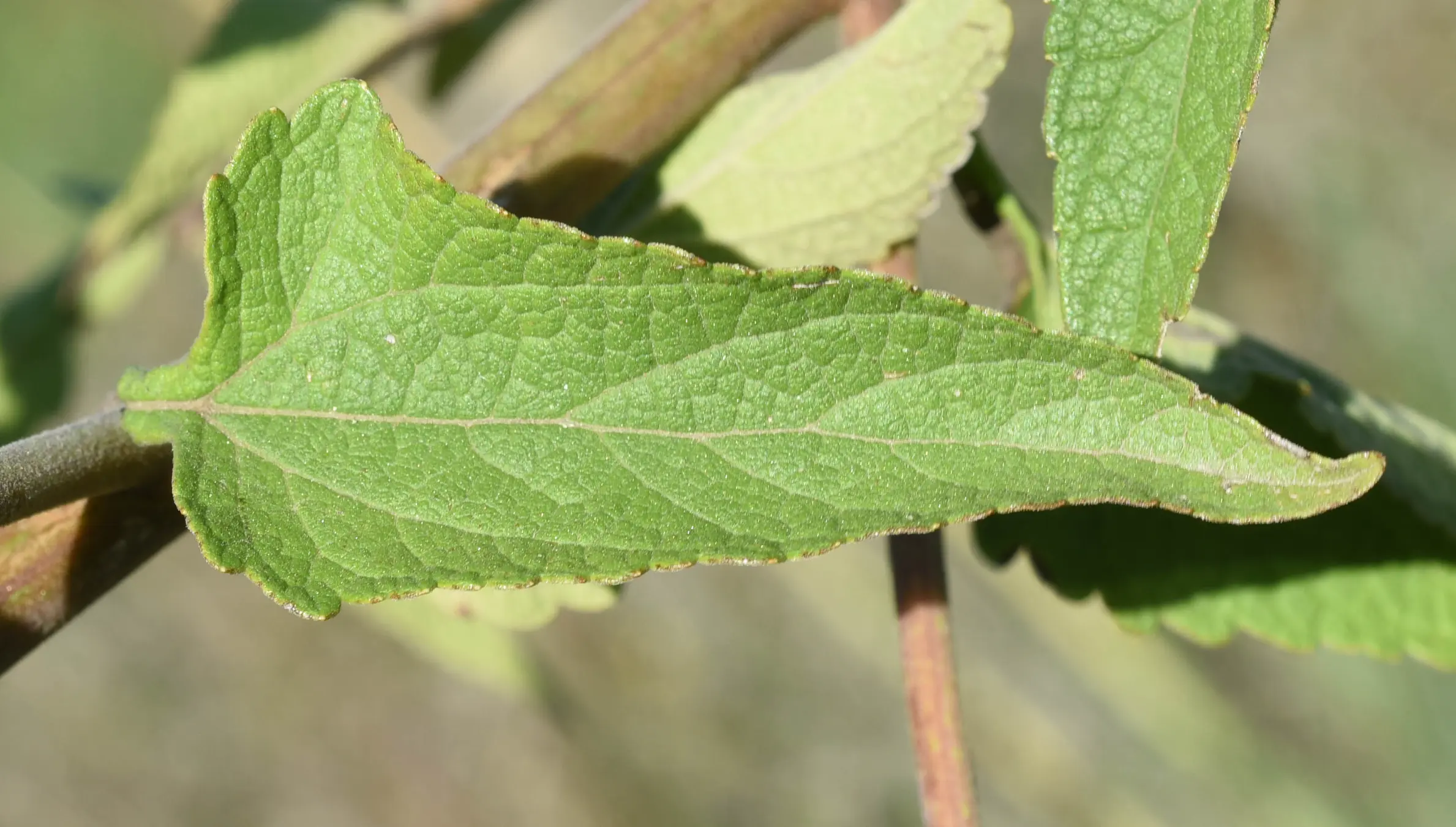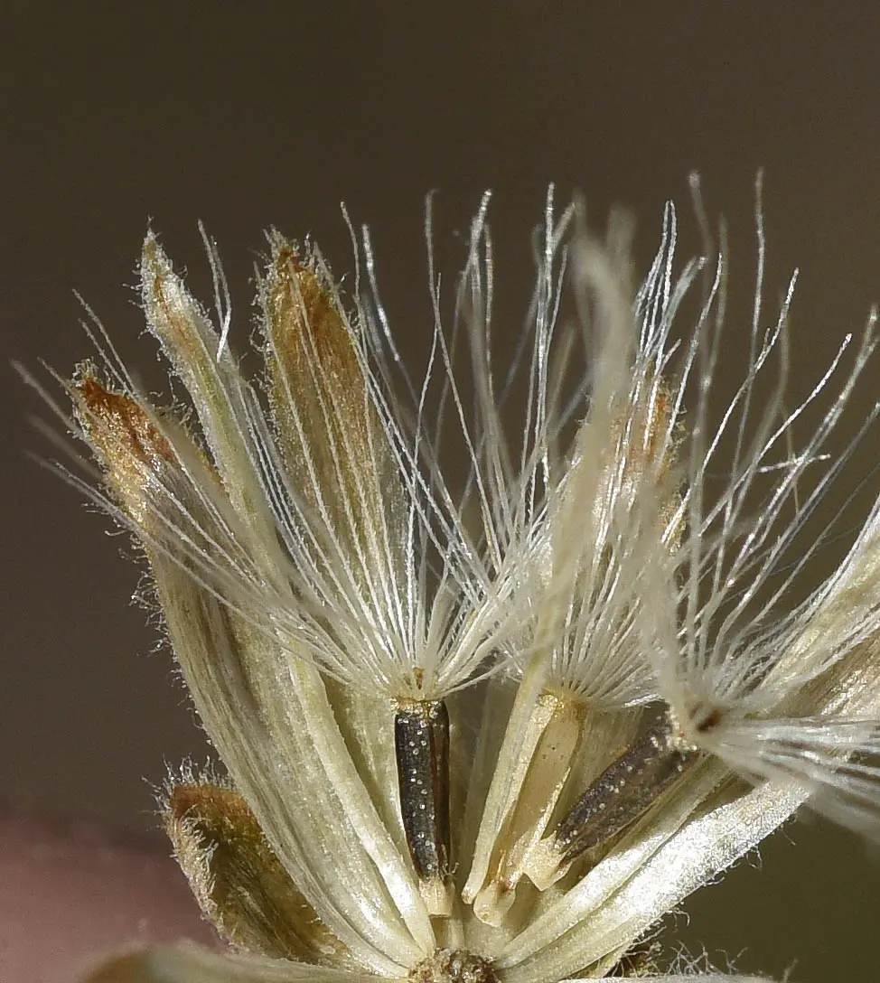 Sufrútices de (0,5-)1-2 m de altura, tallos erectos, ramificados distalmente, cilíndricos, pubescentes y glandulosos. Hojas opuestas, a veces subopuestas o alternas en la capitulescencia, 53-110 x 17-38 mm, pecíolos 6-21 mm de largo, láminas ovadas o angostamente ovadas, enteras, base cuneada y decurrente en el pecíolo, ápice agudo o obtuso, laxamente pubescentes en la cara adaxial, pubescentes y punteado-glandulosas en la cara abaxial, trinervadas, herbáceas, ligeramente discoloras, margen aserrado a subentero, levemente revoluto. Capítulos homógamos, numerosos, agregados en capitulescencias terminales corimbiformes, pedúnculos 1-4,5 mm de largo, pubescente y glanduloso, con tricomas ascendentes, brácteas 0 a 2 por pedúnculo, angostamente oblongas. Involucros 5-6,5 x 2-2,5 mm, cilíndricos, filarias graduadas en tamaño, dispuestas en 3 a 4 series; filarias externas ovadas, base obtusa, ápice redondeado, pubescentes y glandulosas, palmatinervadas, membranáceas, margen membranoso, ciliado; filarias internas angostamente obovadas, base atenuada, ápice redondeado, pubescentes o pubérulas en el ápice, trinervadas, membranáceas, margen no diferenciado o apenas diferenciado, membranoso, fimbriado. Receptáculos epaleáceos, planos o algo convexos, escrobiculados. Flores 11 a 13, perfectas; corolas tubulosas, 3,8-4,4 mm de largo, blancas, abruptamente ensanchadas, glandulosas en la porción basal, lóbulos 5, 0,4-0,5 mm de largo, anchamente ovados, glandulosos en el dorso; anteropodio presente, anteras 1,3-1,6 mm de largo, base redondeada, apéndice conectival ovado u oblongo, ápice redondeado; estilo 5,6-7,2 mm de largo, base no engrosada y pubescente, ramas estilares 2,9-3,7 mm de largo, lineares, ensanchadas distalmente, ápice redondeado, papilosas, superficie estgimática en bandas marginales, 1-1,3 mm de largo, apéndice estéril 1,8-2,3 mm de largo. Aquenios 1,9-2,7 mm de largo, obcónicos, prismáticos, 5-costados, carpopodio cilíndrico, 0,2-0,3 mm de largo, glandulosos. Papus 3,9-4,8 mm de largo, formado por numerosas cerdas escabrosas, blanquecinas, dispuestas en 1 serie.