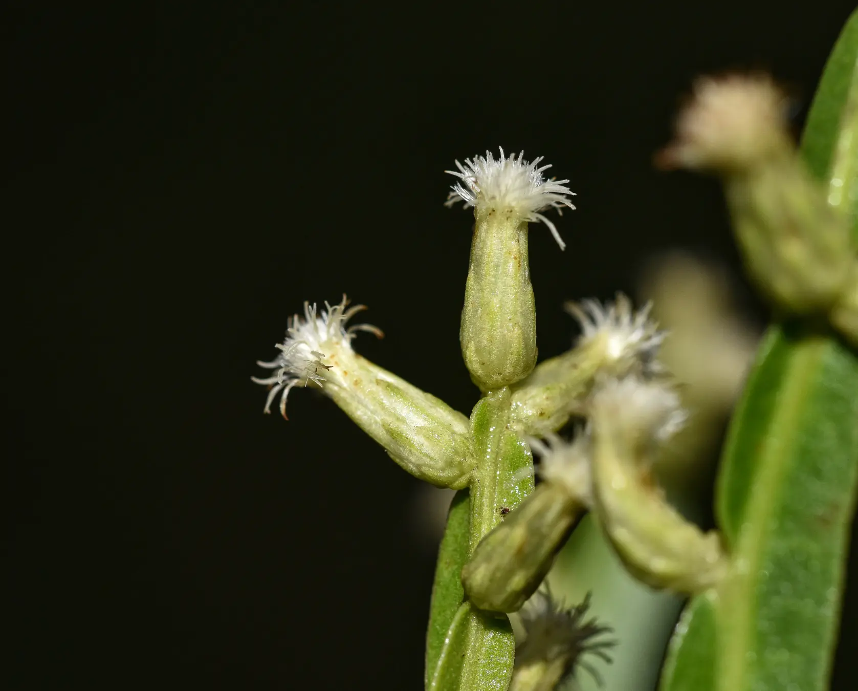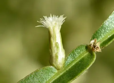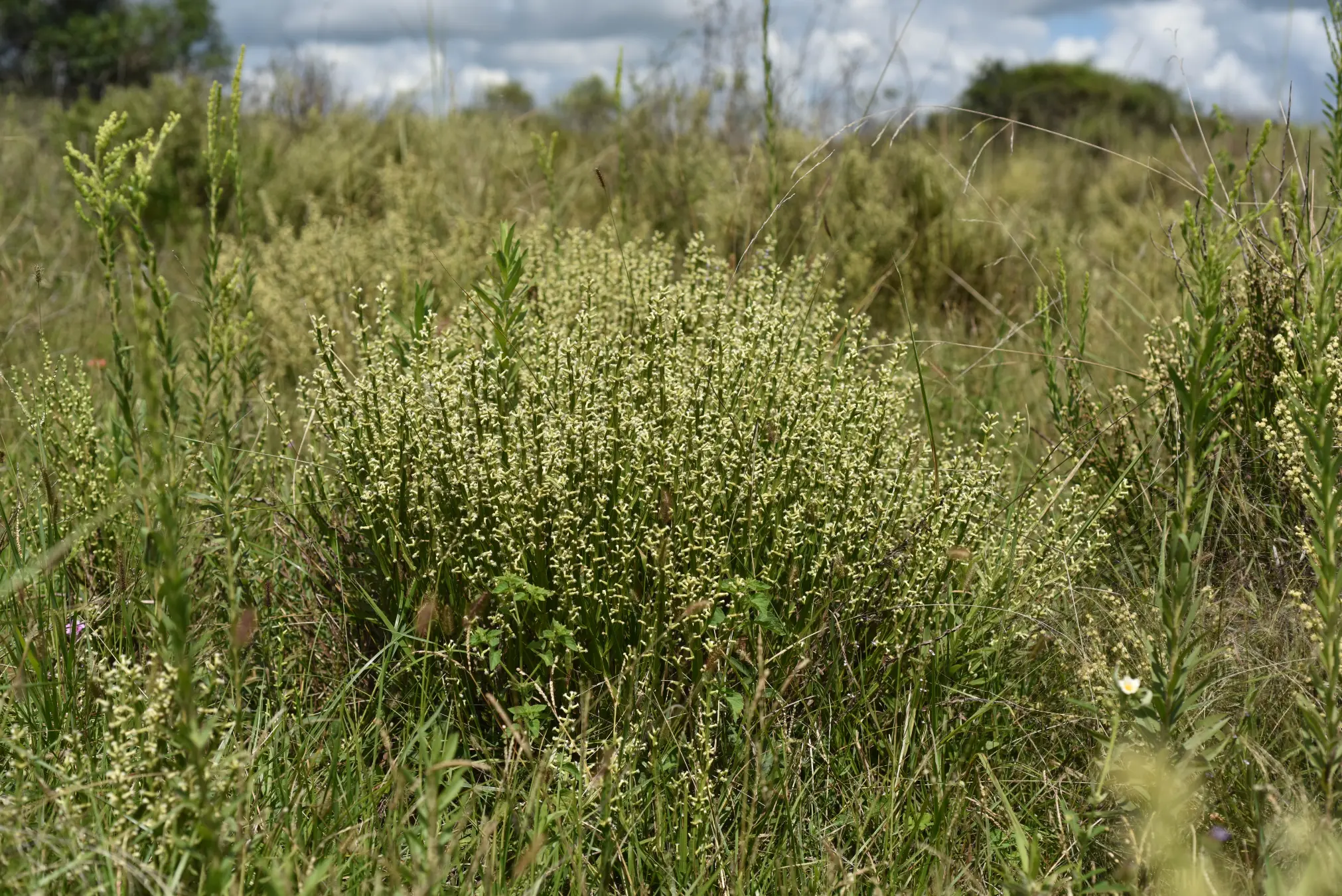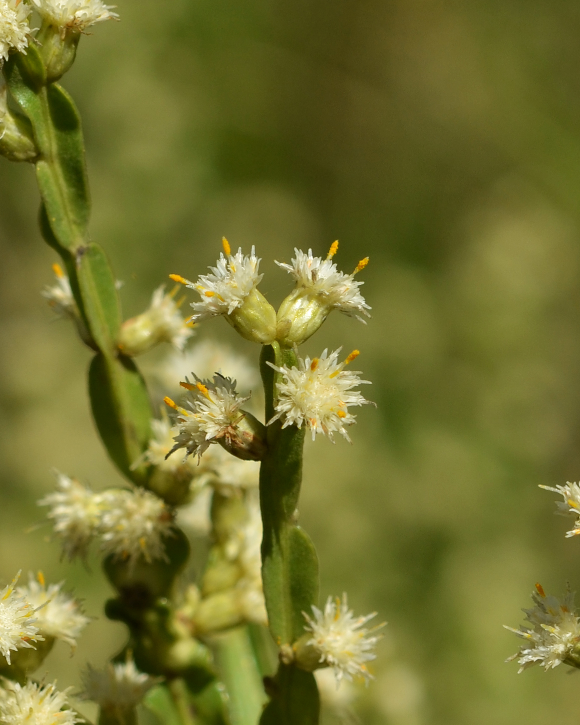 Sufrútices 40-75 (280) cm de altura, tallos erectos y rizomas, tallos y alas pubérulos, resinosos, 3-alados, alas 2,0-7,5 x 0,3-1,1 cm, elípticas, ovadas, obovadas a oblongas, planas. La relación entre el ancho del ala máximo y el ancho del ala mínimo es 1,8, la relación largo/ancho en la zona media es 7,97 y en la zona apical es 10,79. Hojas reducidas, alternas, espiraladas, sésiles, 1-3 x 0,6-2,5 mm, triangulares, ovadas, base truncada, ápice agudo, pilosas. Capítulos sésiles, solitarios y en glomérulos de 2-4 (6) capítulos; organizados en capitulescencias espiciformes de 9-21,5 cm de longitud, terminales y en ramas laterales. Capítulos estaminados con involucros de 3,3-4 x 2,2-3,5 mm, cilíndricos a campanulados, filarias en 5-7 series; filarias externas 1-1,7 x 0,8-1,5 mm, elípticas, ovadas a obovadas, base truncada, ápice agudo, pubescentes, margen hialino-membranáceo, ciliado; filarias internas 2,9-4,1 x 0,4-0,85 mm, angostamente elípticas, base atenuada, ápice agudo, pilosas en la base y próximo al nervio medio, margen hialino-membranáceo, entero hacia la base y ciliado hacia el ápice. Receptáculos planos, alveolados. Flores 15-28; corolas tubulosas, blancas, 5-lobuladas, tubo 1,5-3 mm de largo, cilíndrico de ancho uniforme, lóbulos de 1,2-1,8 mm de largo, angostamente elípticos de ápice agudo; estilo 3,9-5,6 mm, ramas estilares fusionadas o libres de 0,2-0,4 mm de largo, angostamente elípticas, tricomas colectores en la cara abaxial y por debajo del punto de bifurcación de las ramas, estilopodio presente, disco nectarífero ca. 0,4 mm de largo y de ápice crenulado, ovario rudimentario 0,1-0,2 mm de largo; anteras 0,8-1,2 mm de largo, oblongas, base cordada, apéndice conectival 0,25-0,33 x 0,1-0,2 mm, ovado de ápice agudo. Papus 3,5-4 mm de largo, cerdas 15-25, escabrosas, aplanadas, crespas y ensanchadas gradualmente hacia el ápice, fusionadas en la base, dispuestas en 1 serie. Capítulos pistilados con involucros de 3,5-8 x 1,7-3,3 mm, cilíndricos, filarias en 6-7 series; filarias externas 1,1-1,6 x 0,8-1,5 mm, elípticas, ovadas, triangulares, base truncada, ápice agudo, pilosas próximo al nervio medio, margen hialino-membranáceo, entero hacia la base y ciliado hacia el ápice; filarias internas 3,5-6,3 x 0,3-1,2 mm, angostamente elípticas, lineares, base truncada, ápice obtuso, agudo, pilosas próximo al nervio medio y en la mitad apical, margen hialino-membranáceo, entero en la mitad basal y ciliado en la mitad apical. Receptáculos planos, alveolados a fimbriolados. Flores 33-44; corolas filiformes, blancas, 3-4,5 mm de largo, 3-5 lobuladas, lóbulos obtusos de largo desigual, y/o con limbo breve de 0,2-0,3 mm de largo; estilos 3,7-6,1 mm de largo, ramas estilares (0,2) 0,6-1 mm de largo, angostamente elípticas a lineares, ápice agudo, estilopodio presente. Aquenios (0,8)1,1-1,5 mm de largo, cilíndricos, 8-16 costados, papilosos, carpopodio presente. Papus 4,5-5 mm de largo, cerdas 20-27, escabrosas algo ensanchadas hacia el ápice, fusionadas en la base, elementos dispuestos en 1 serie, persistentes.
